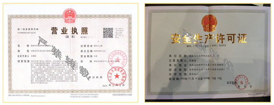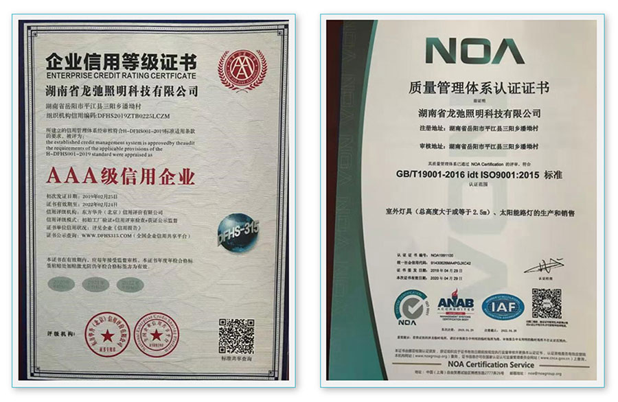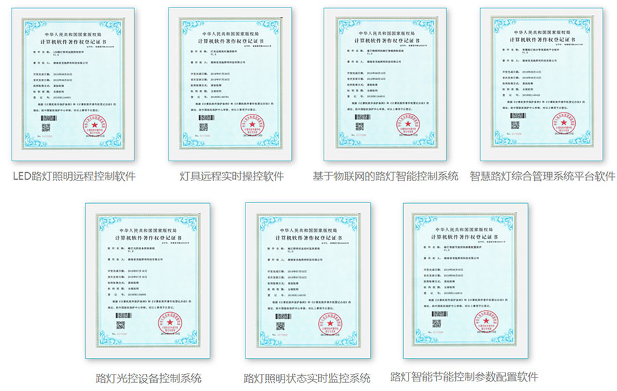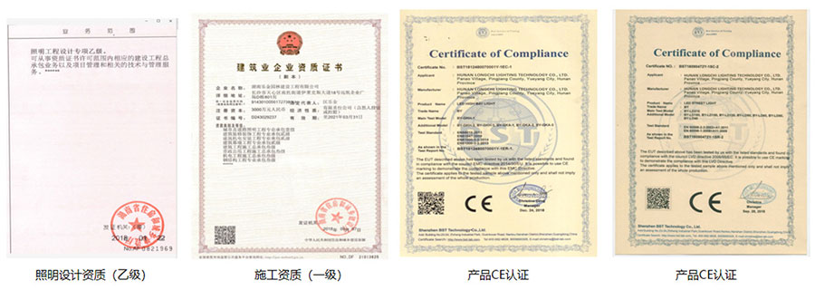 公司已取得高新技术企业认证,拥有城市及道路照明施工三级资质,通过了ISO9001国家质量管理体系,公司研发及生产的产品,获得国家质量管理认证和CE认证,公司拥有多项产品发明专利。