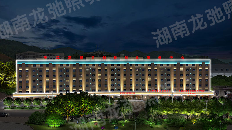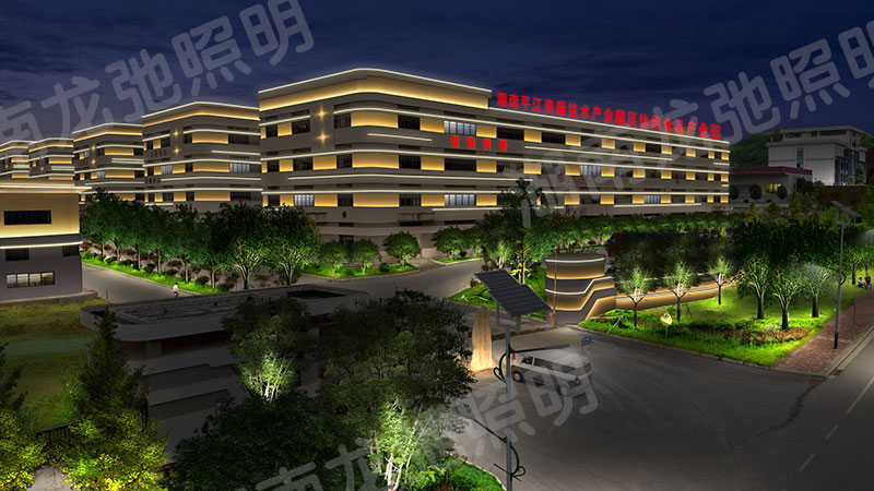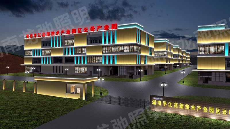 产业园方案厂房采用线条灯勾勒房屋造型,用黄色洗墙灯补强建筑物的厚重感,中间添加十字星空灯进行点缀,做到简洁大方,稳重端庄及体现云母材质的耀眼特色。同时灯具外壳采用与楼体外墙颜色一致,做到白天见墙不见灯的整体效果。还会根据不同大楼的结构与造型,进行相应调整园区整理亮化特色,做到尽量风格相同,但又各有特色;